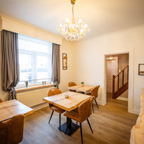 Our inviting breakfast room is located on the ground floor and offers a warm, welcoming ambiance to start your day right. The space features three beautiful oak breakfast tables where you can enjoy your meal in peace.